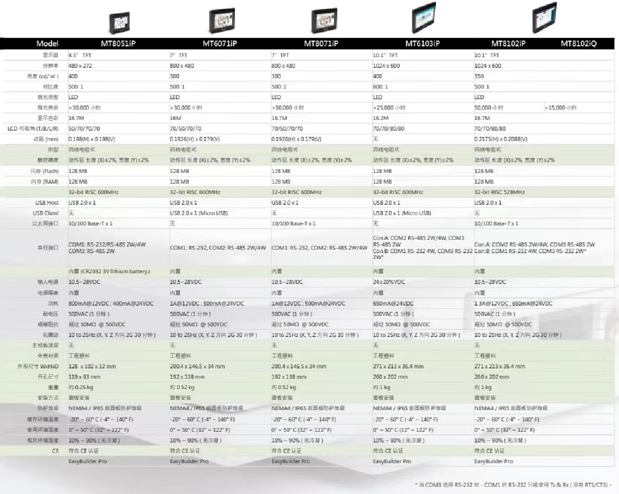 采用EasyBuilder pro組態(tài)軟件編程更方便,完全兼容EasyBuilder8000,開孔尺寸和連接器(USB client除外),完全與TK及MT(IH)系列兼容,1600萬高彩度顯示,支援超過300種通訊驅動,可連接多種不同廠家的PLC及控制器,搭載Cortex A8 600MHzCPU.128MB Flash、128MB RAM.
