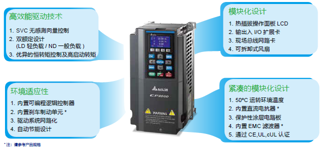 CP2000系列為無感矢量控制變頻器,延續(xù)臺達設計團隊對節(jié)能省電理念的一貫性,針對風機、水泵、HVAC Drive相關應用特制化、PID智能調適和優(yōu)異設計的產業(yè)效能所推出的變頻器。其無感矢量控制(SVC)的智能表現(xiàn),適時提升負載轉矩響應,滿足客戶寬廣的變轉矩負載需求,提升馬達在一般用途的效能。3段式V/F冪級曲線響應,能在變動轉矩負載的環(huán)境下,適時的調整輸入電壓來提高整體效能,特別是水泵,風機負載之類的應用。FLYING START、自動加減速功能、瞬時停電再啟動,馬達參數AUTO-TUNING等功能,對變轉矩負載的環(huán)境操作及保護,提供適當的運行及節(jié)能方案