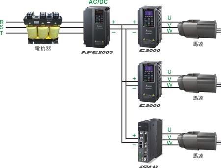 取代傳統(tǒng)動(dòng)態(tài)煞車電阻裝置。一般傳統(tǒng)交流變頻器驅(qū)動(dòng)馬達(dá)在運(yùn)動(dòng)瞬間或頻繁煞車時(shí),利用安裝高瓦數(shù)的煞車電阻來(lái)吸收過(guò)多的反饋能量,并轉(zhuǎn)成熱能散發(fā)。解決負(fù)載能量反饋但效率不佳,且增加硬件額外費(fèi)用與空間。使用AFE2000系列之后,負(fù)載反饋的能量不需要再轉(zhuǎn)換成熱能散發(fā)掉,相對(duì)的可以將反饋能量回饋到電網(wǎng),省電省錢而且環(huán)保,如下圖所示。